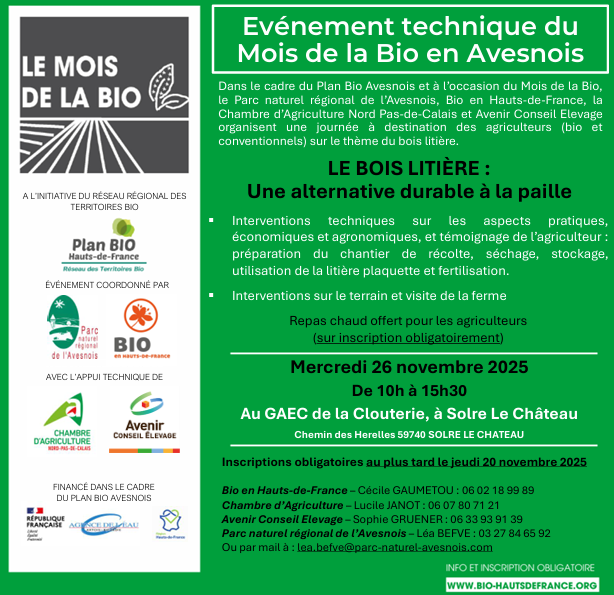 Dans le cadre du Plan Bio Avesnois et à l’occasion du Mois de la Bio, le Parc naturel régional de l’Avesnois, Bio en Hauts-de-France, la Chambre d’Agriculture Nord Pas-de-Calais et Avenir Conseil Elevage organisent une journée à destination des agriculteurs (bio et conventionnels) sur le thème du bois litière.