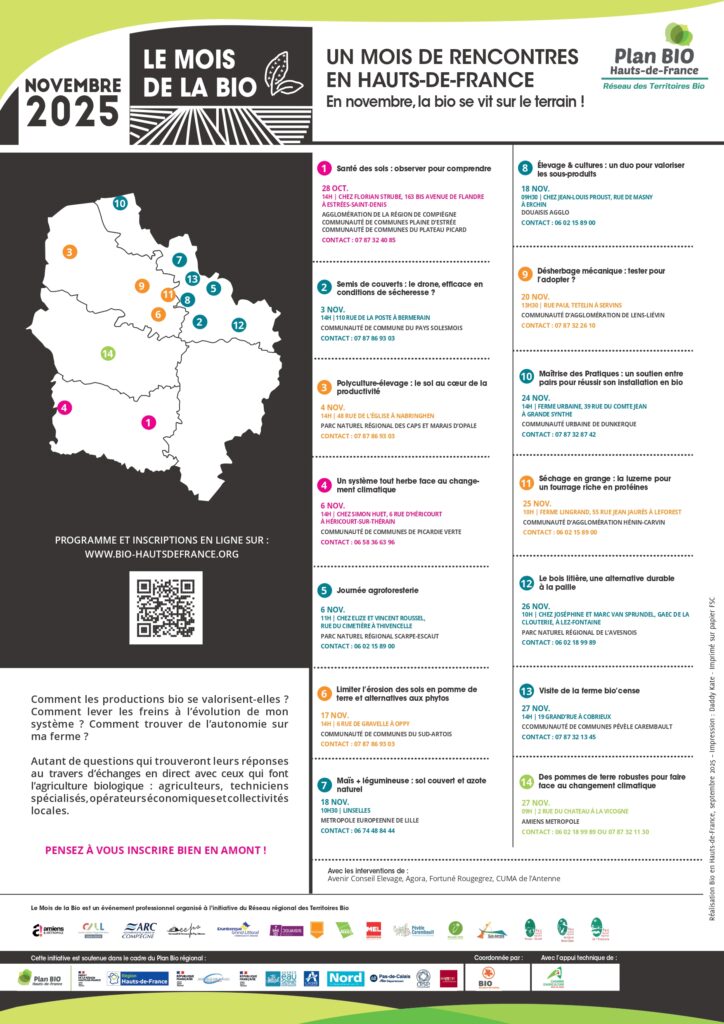Le Mois de la Bio revient en novembre 2025 et propose de nombreux rendez-vous gratuits répartis dans toute la région Hauts-de-France : visites de fermes et d’entreprises, réunions techniques et d’information, témoignages… L’événement se destine aux professionnels de l’agriculture. L’ambition ? Proposer un temps fort ponctué de rencontres, d’échanges, de transmission, de découvertes autour de l’agriculture bio… ouvert à tous.
