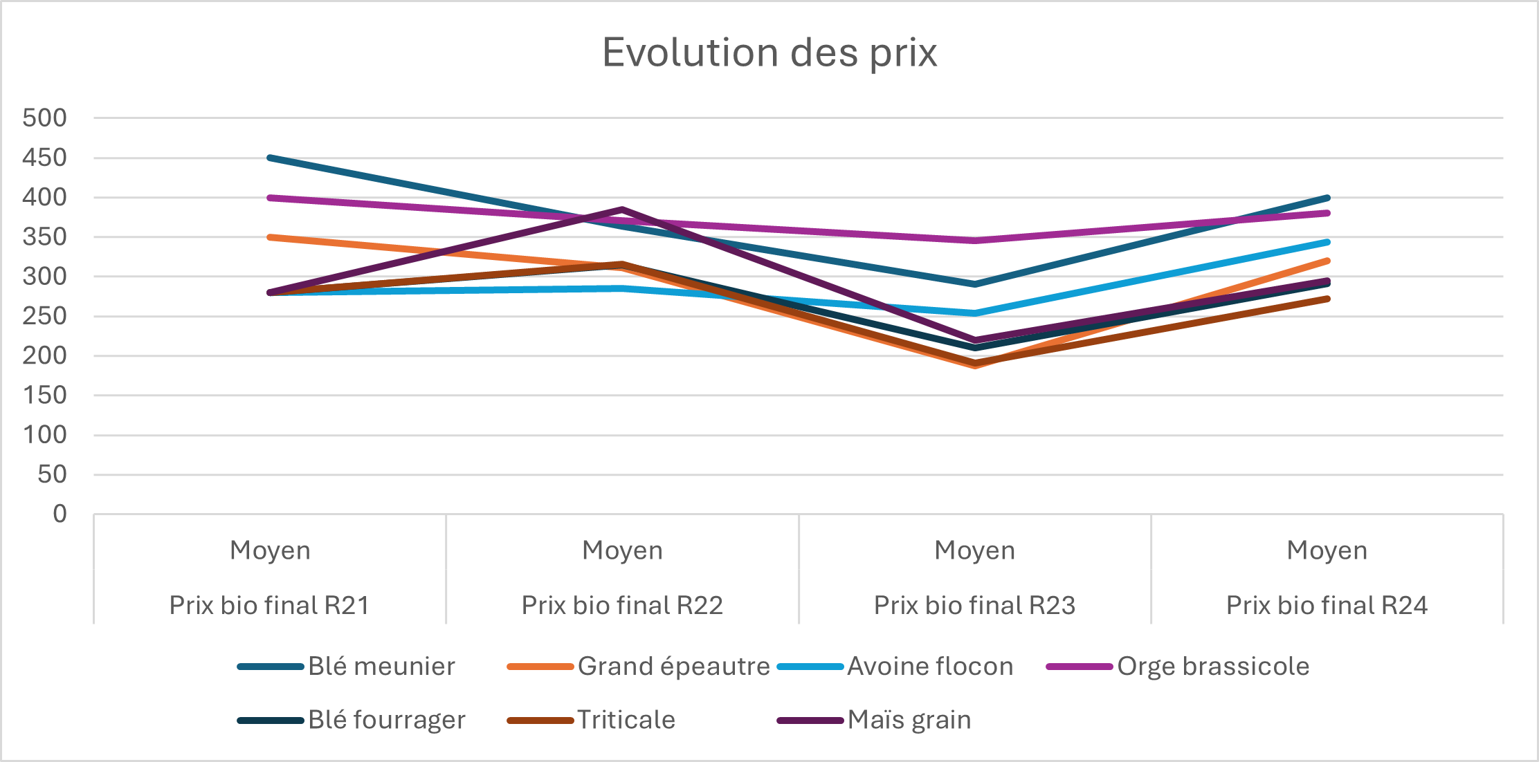Les données ci-dessous sont issues d’enquêtes réalisées auprès des Organismes Stockeurs (OS) depuis 2022 qui collectent sur la zone Hauts-de-France (5 coopératives en 2024). Il s’agit des prix finaux bio, départ ferme.